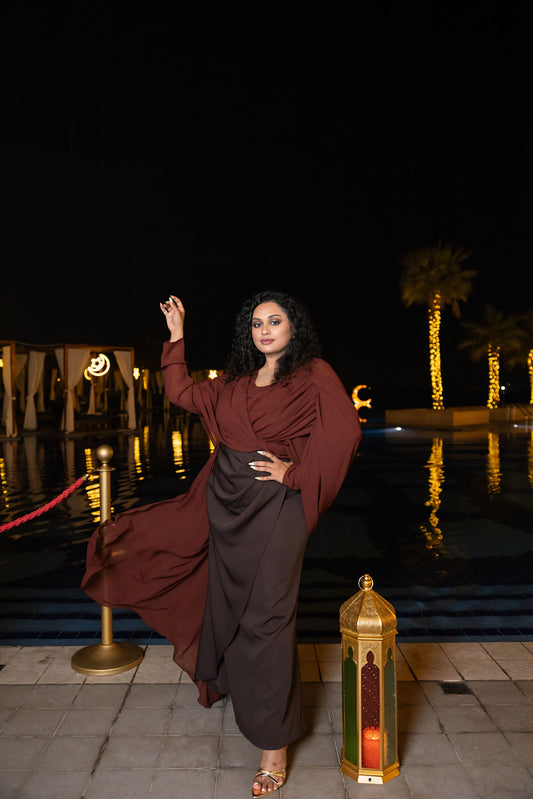 The fabric choice, the weight of the inner dress and the flow of the chiffon throw on …everything is just so perfect ! Somehow, the cut is so well-made , it complements our body shape while keeping it modest and elegant. Made with love and perfection. So glad for this experience 🤍