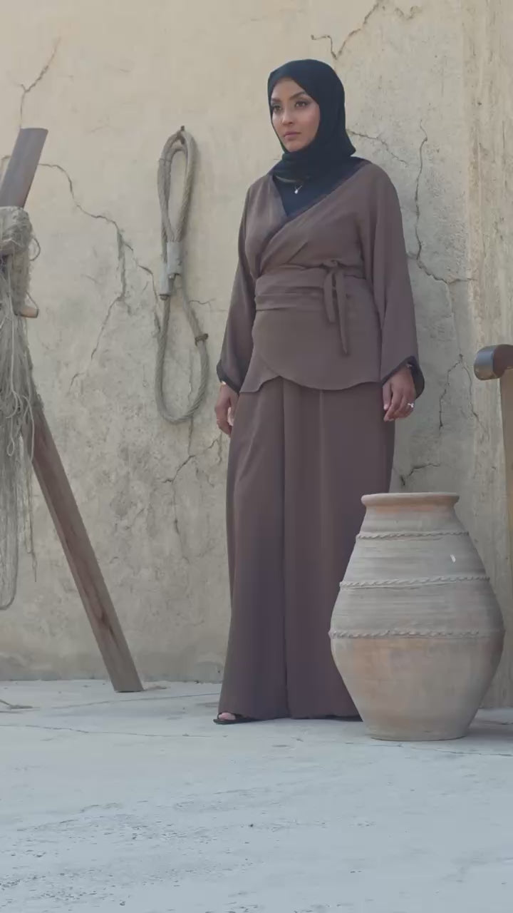 • Signature Pleated Pants: High-waisted with a wide-leg cut, these pants feature fluid pleating that offers both structure and breathability, ideal for modest elegance under a warm weather. Its stretchy adjustable waist allows the confort of lounge wear while providing an elegant sleek finish.