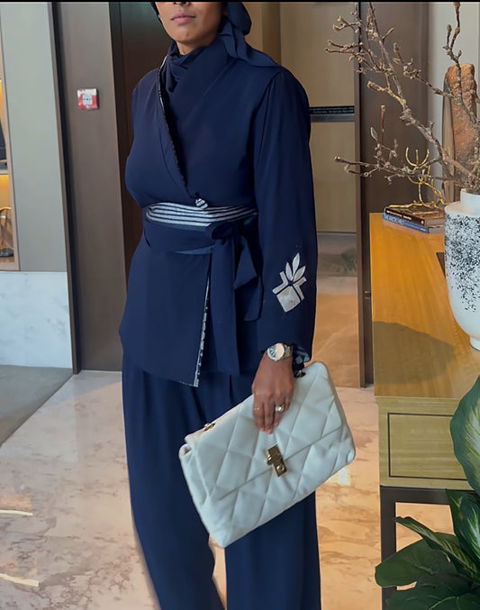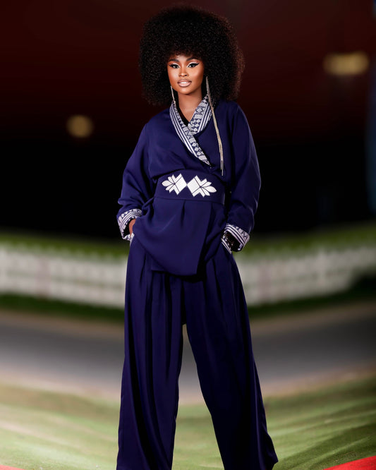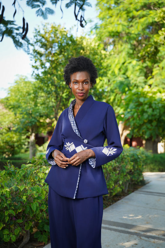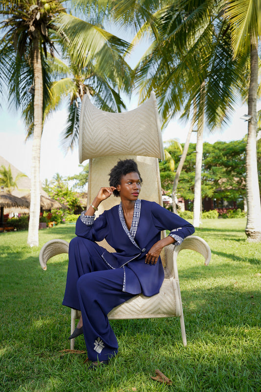 The Rosa Set is the epitome of "Business Chic" with a cultural soul. It is ideally suited for executive meetings, keynote speeches, or upscale networking events. For a professional setting, wear the blazer fastened with the Italian crepe side of the collar facing out. For an evening of celebration or a cultural gala, reverse the cuffs and collar to reveal the vibrant white and blue pagne tissé and pair with a bold red lip to complement the navy blue fabric.
