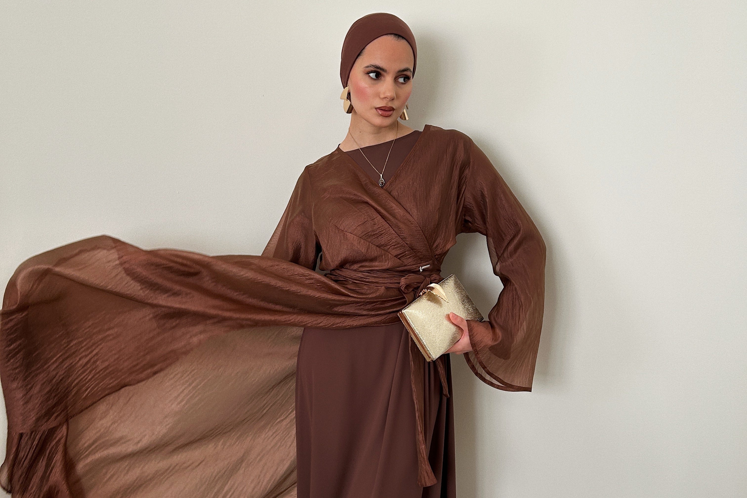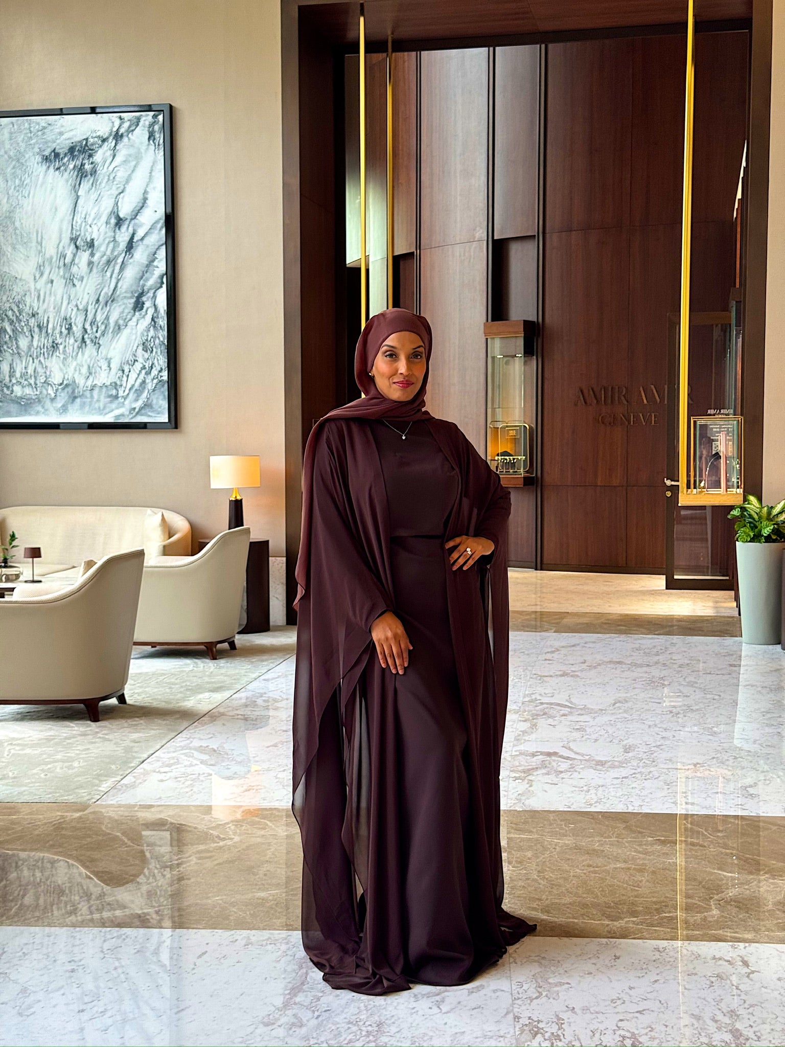 The fabric choice, the weight of the inner dress and the flow of the chiffon throw on …everything is just so perfect ! Somehow, the cut is so well-made , it complements our body shape while keeping it modest and elegant. Made with love and perfection. So glad for this experience 🤍