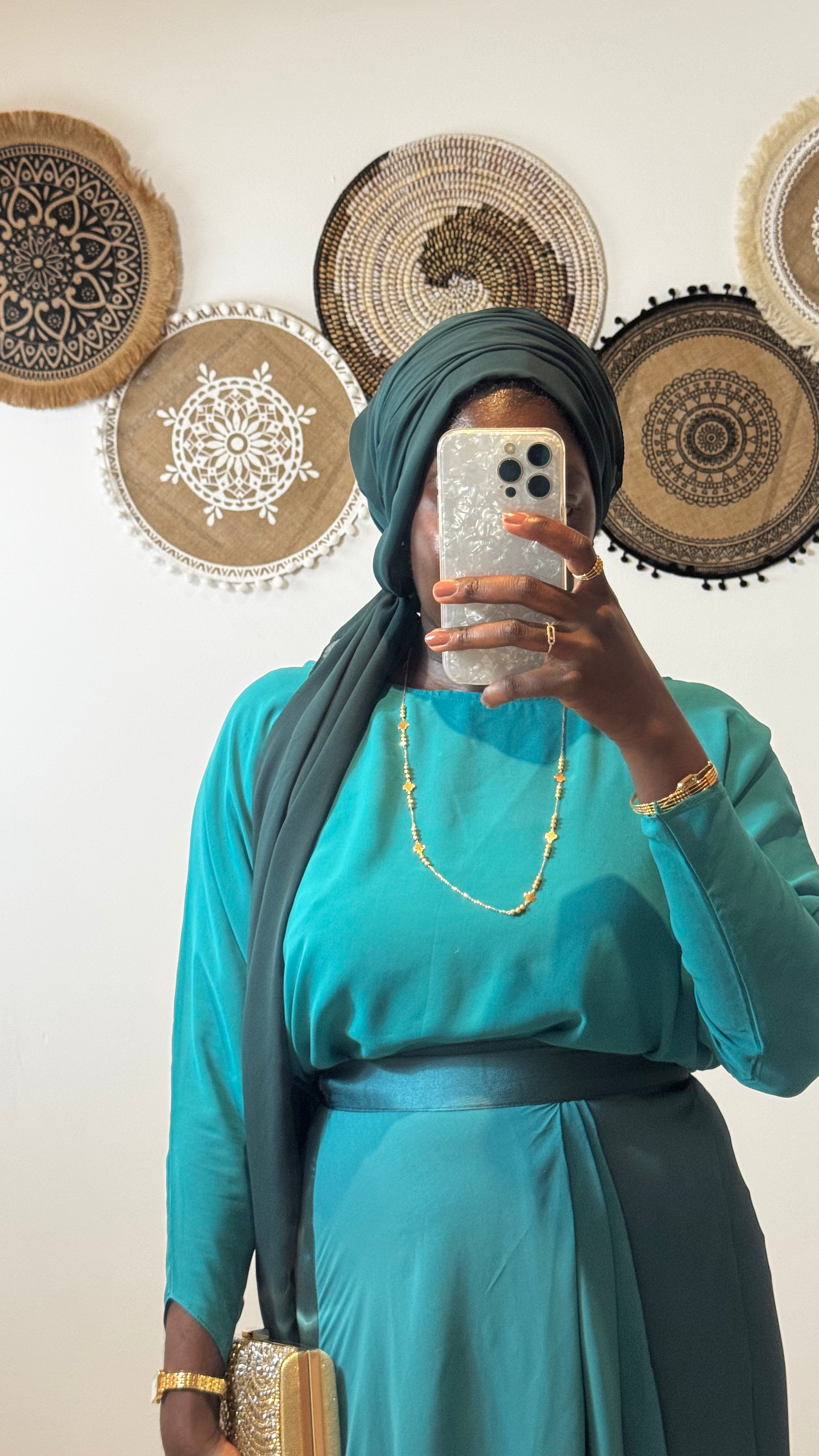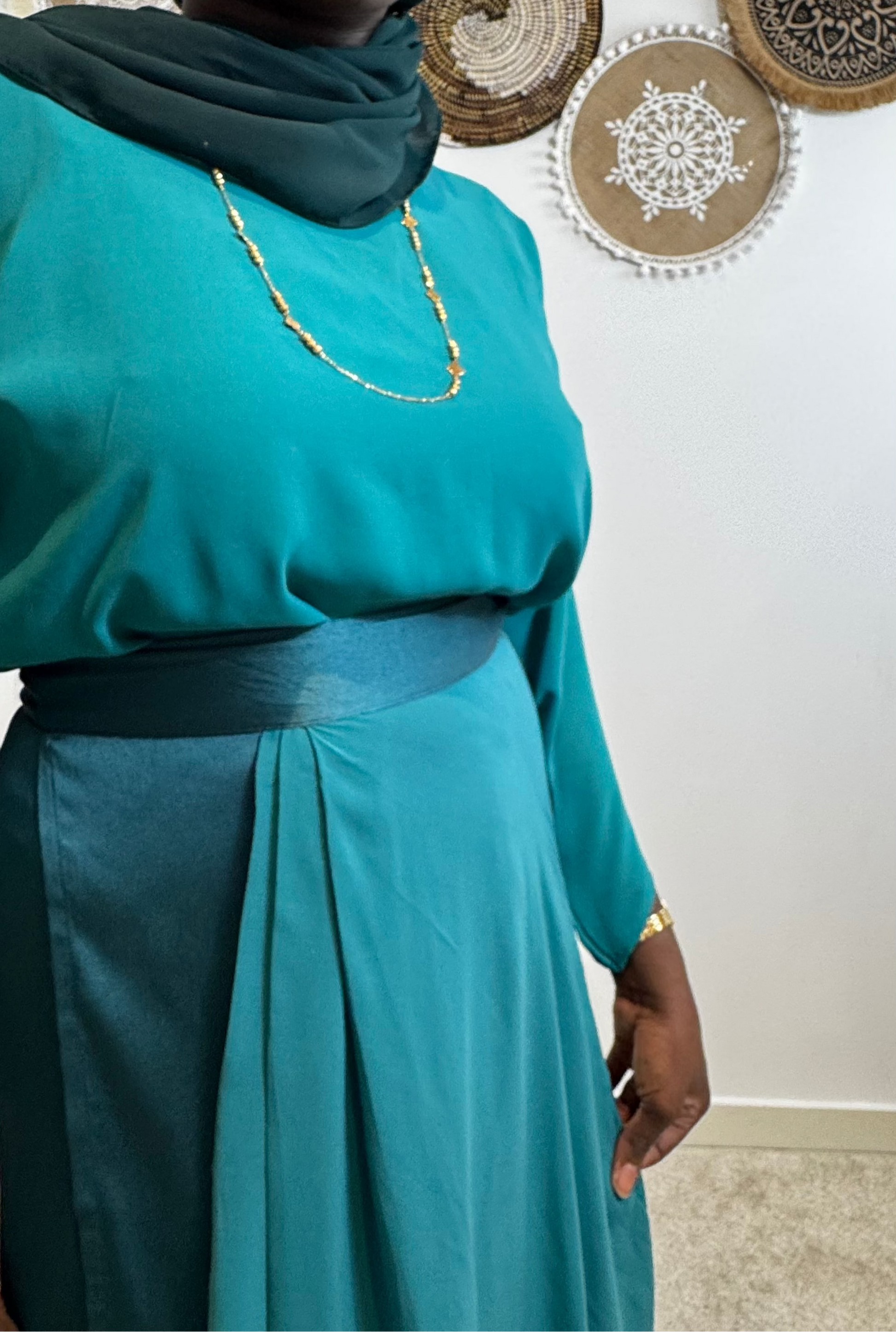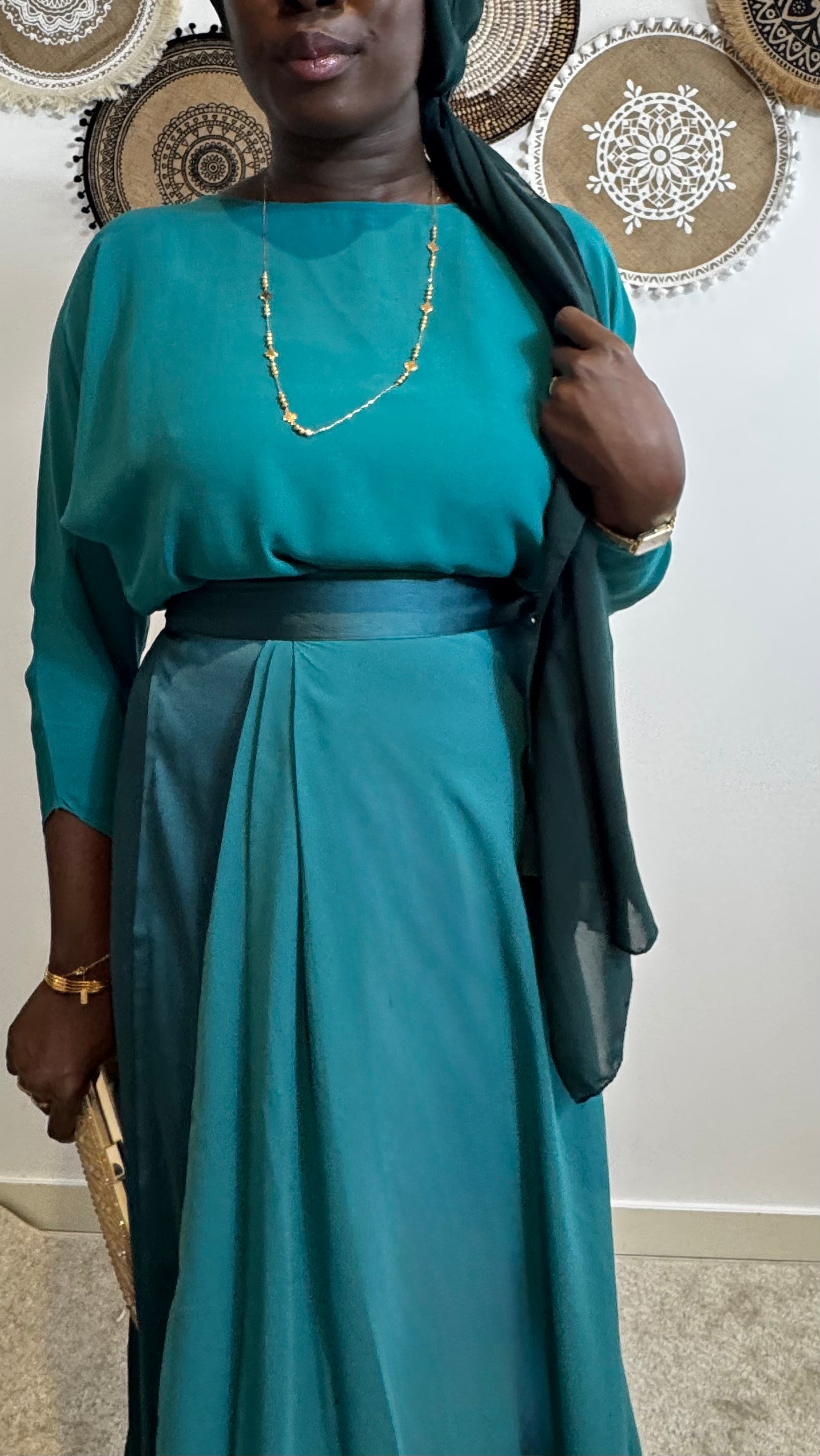 Confectionnée en mousseline de soie et en crêpe de satin luxueux, la robe Aïssa enveloppe délicatement le corps, créant une silhouette fluide. La mousseline de soie offre à la robe un mouvement aérien, presque gracieux, à chaque pas. Elle caresse la peau en douceur, procurant une sensation de confort. Le crêpe de satin, quant à lui, apporte une texture plus riche et plus structurée, avec une finition légèrement brillante qui capte subtilement la lumière.