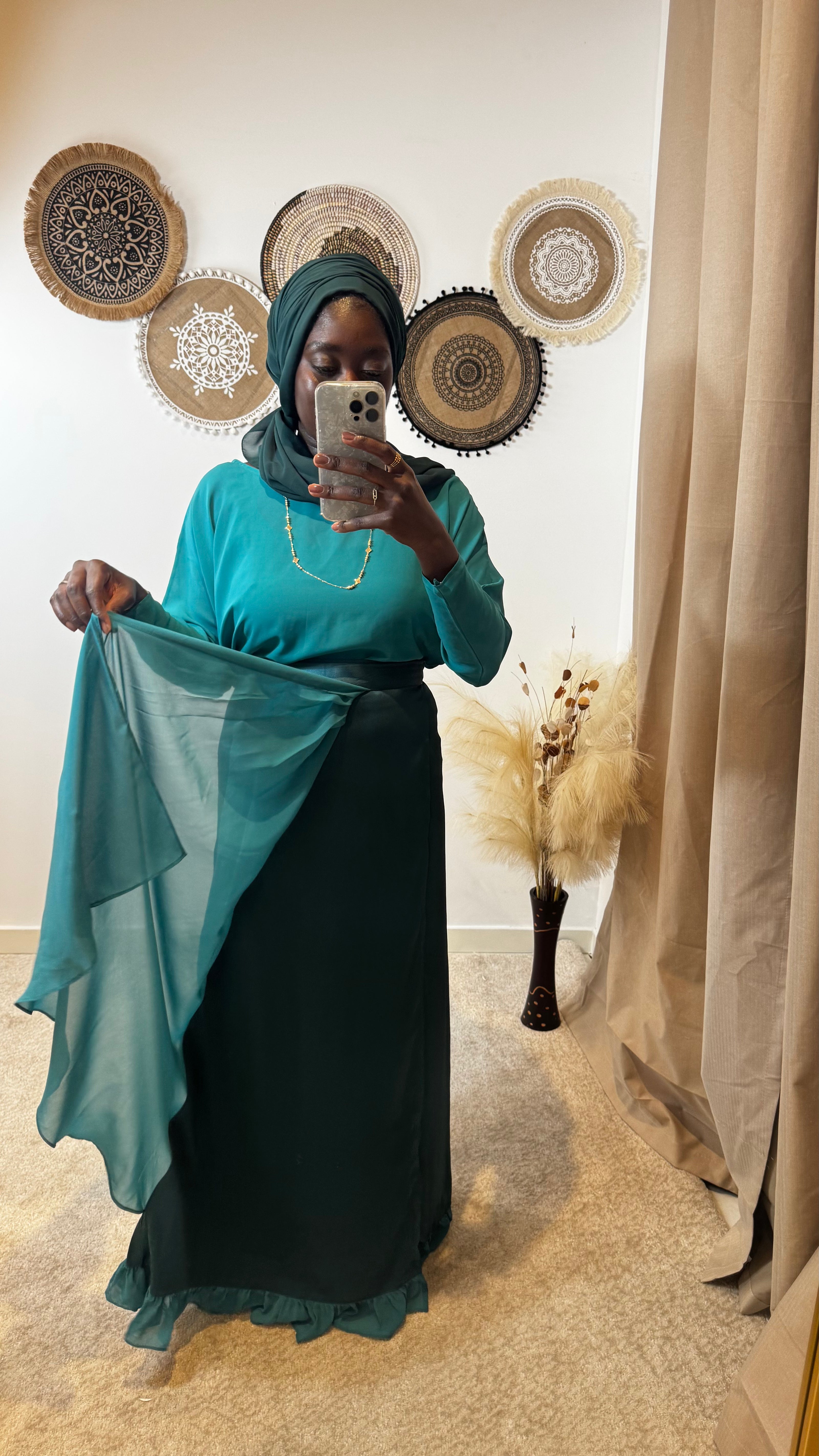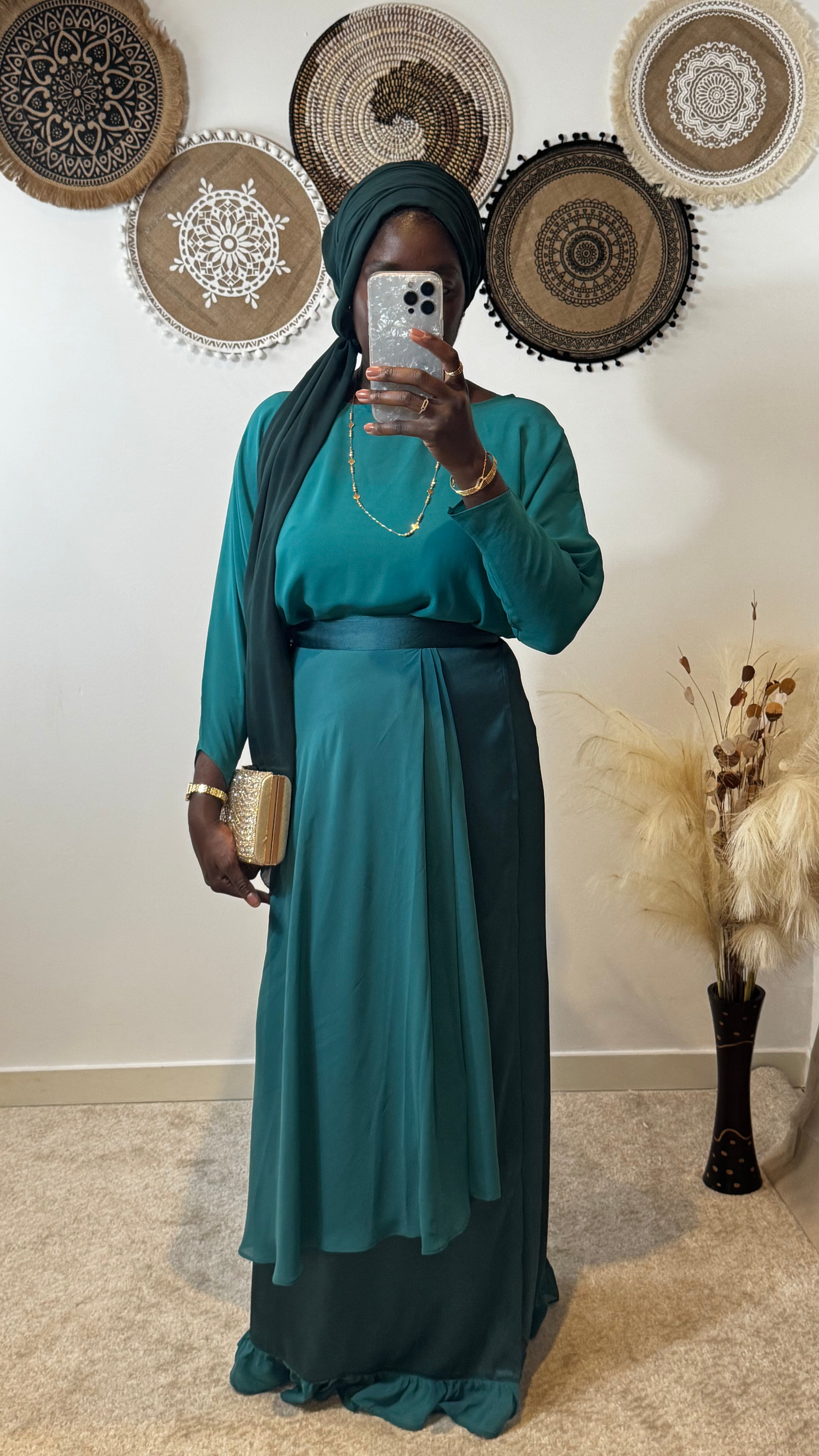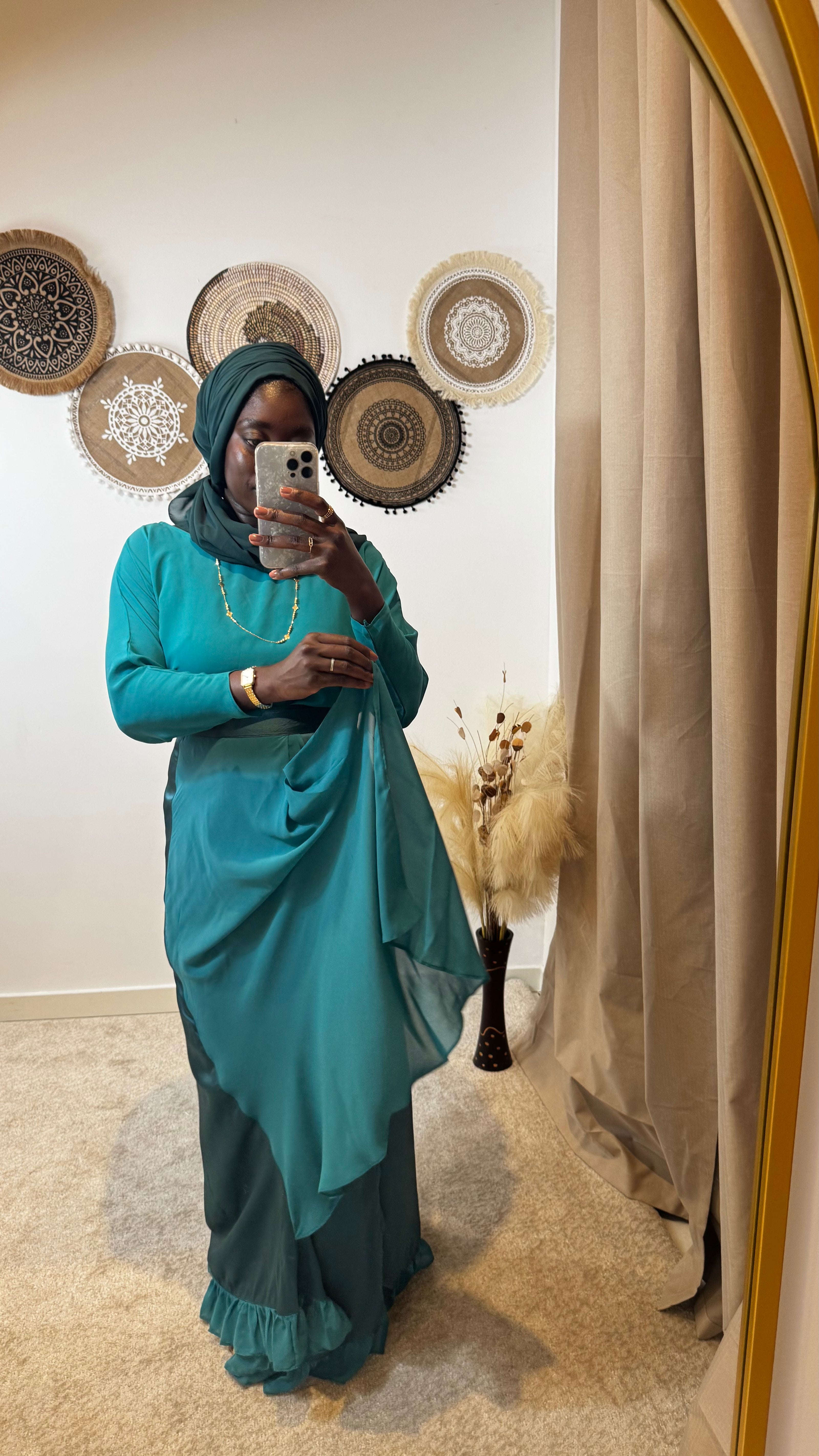Confectionnée en mousseline de soie et en crêpe de satin luxueux, la robe Aïssa enveloppe délicatement le corps, créant une silhouette fluide. La mousseline de soie offre à la robe un mouvement aérien, presque gracieux, à chaque pas. Elle caresse la peau en douceur, procurant une sensation de confort. Le crêpe de satin, quant à lui, apporte une texture plus riche et plus structurée, avec une finition légèrement brillante qui capte subtilement la lumière.