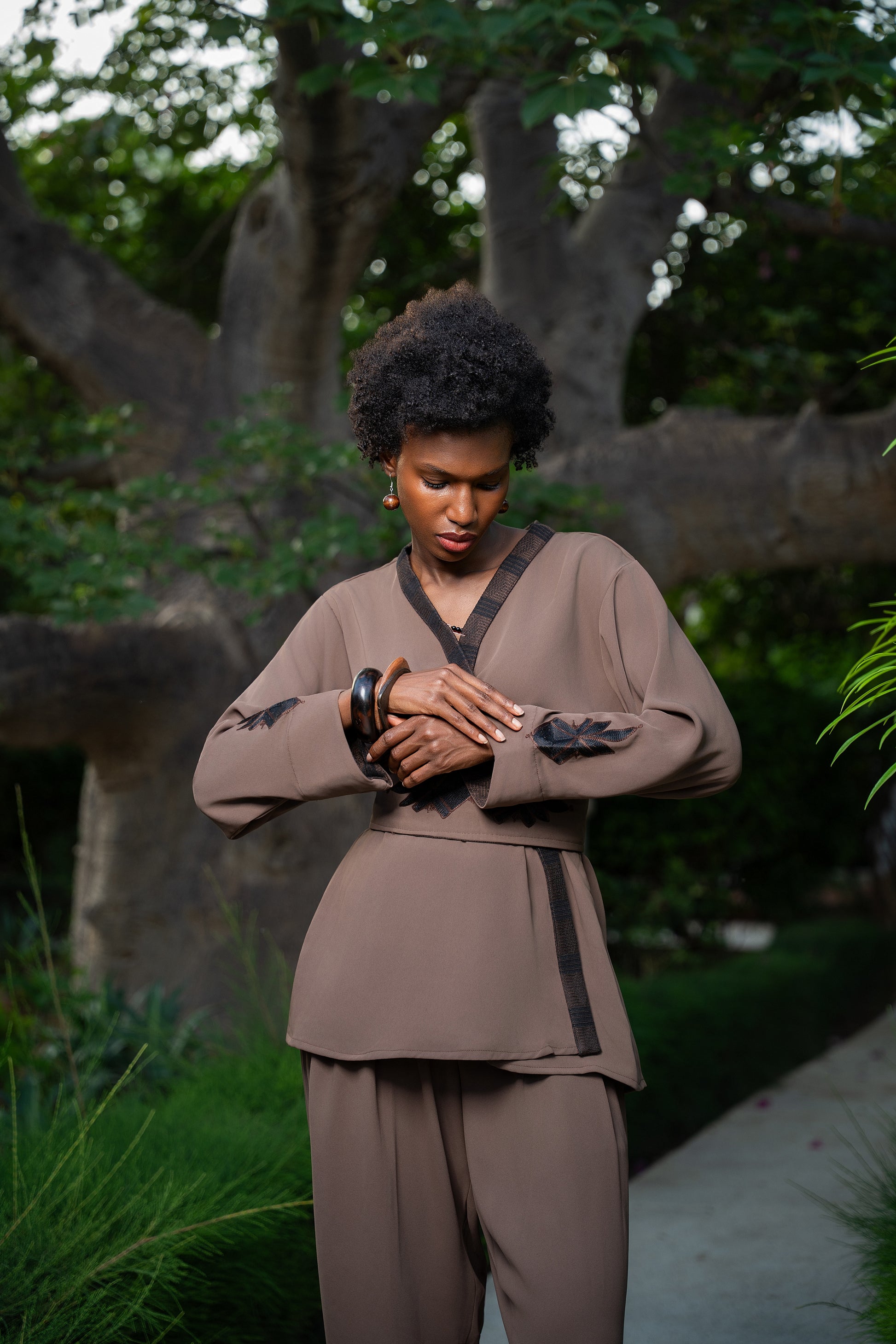 Inspired by the legendary Sogolon Kondé, mother of Sundiata Keita, this set represents resilience and wisdom. The cocoa hue offers warmth and earthiness, while black and brown pagne tissé details anchor it in tradition. A piece for women who carry strength with softness.