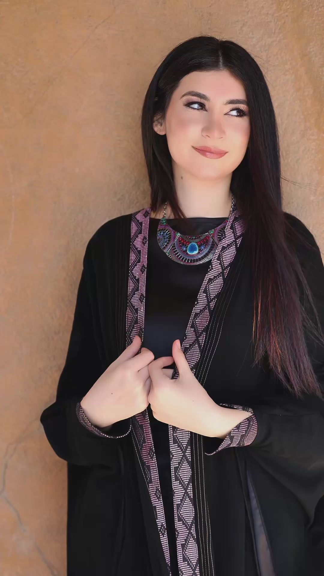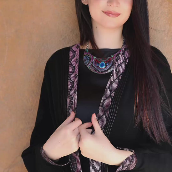 • Contraste artisanal : L'abaya en mousseline de soie noire de jais de qualité supérieure, doublée de soie Armani, offre une base respirante et haut de gamme qui met en valeur les détails vibrants en pagne tissé rose et or.