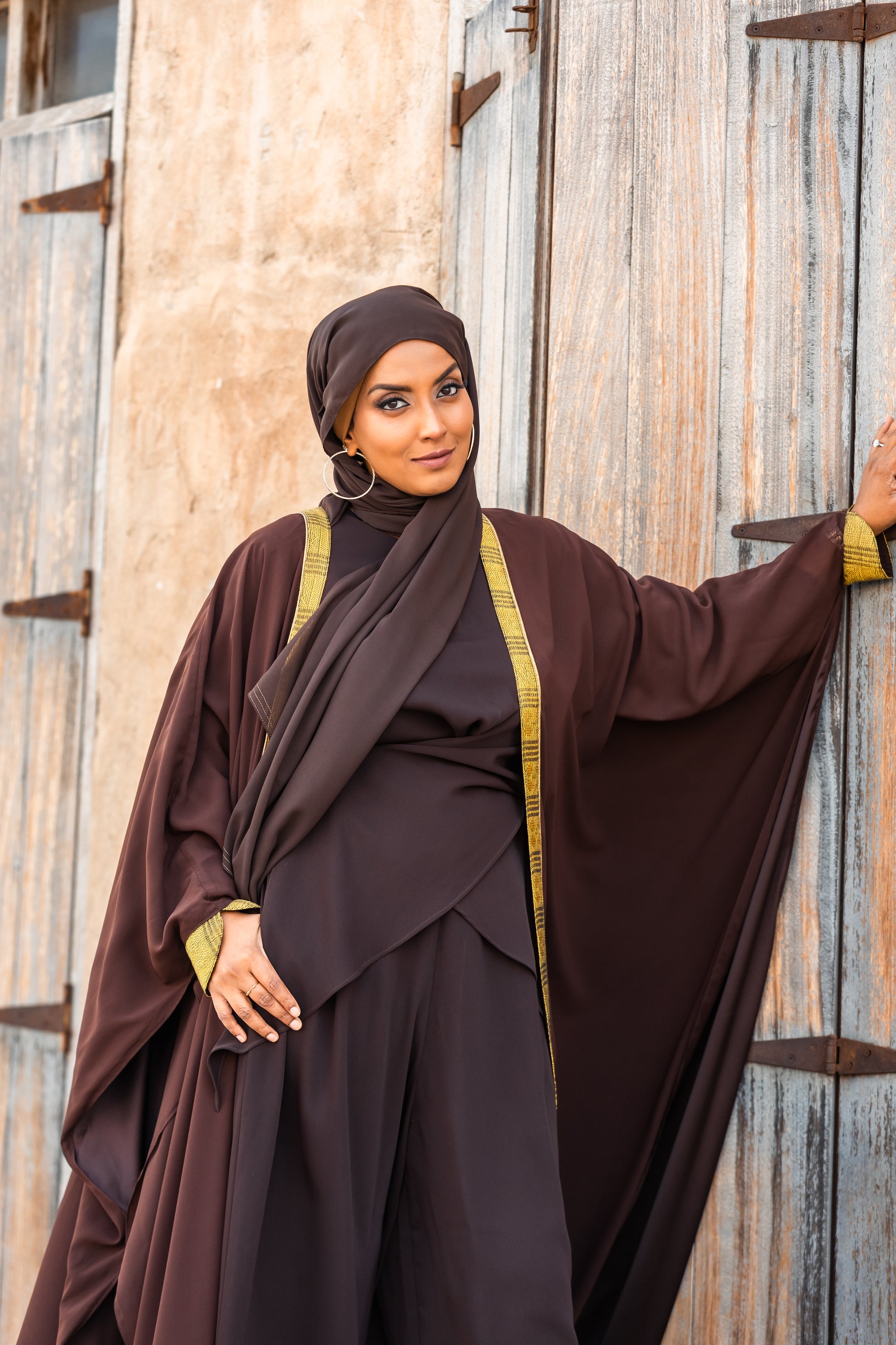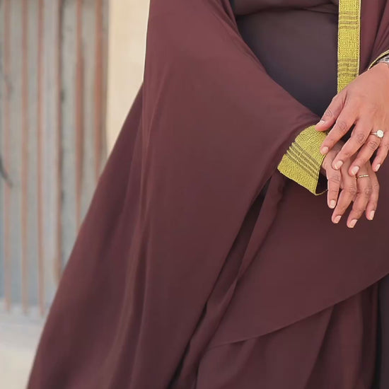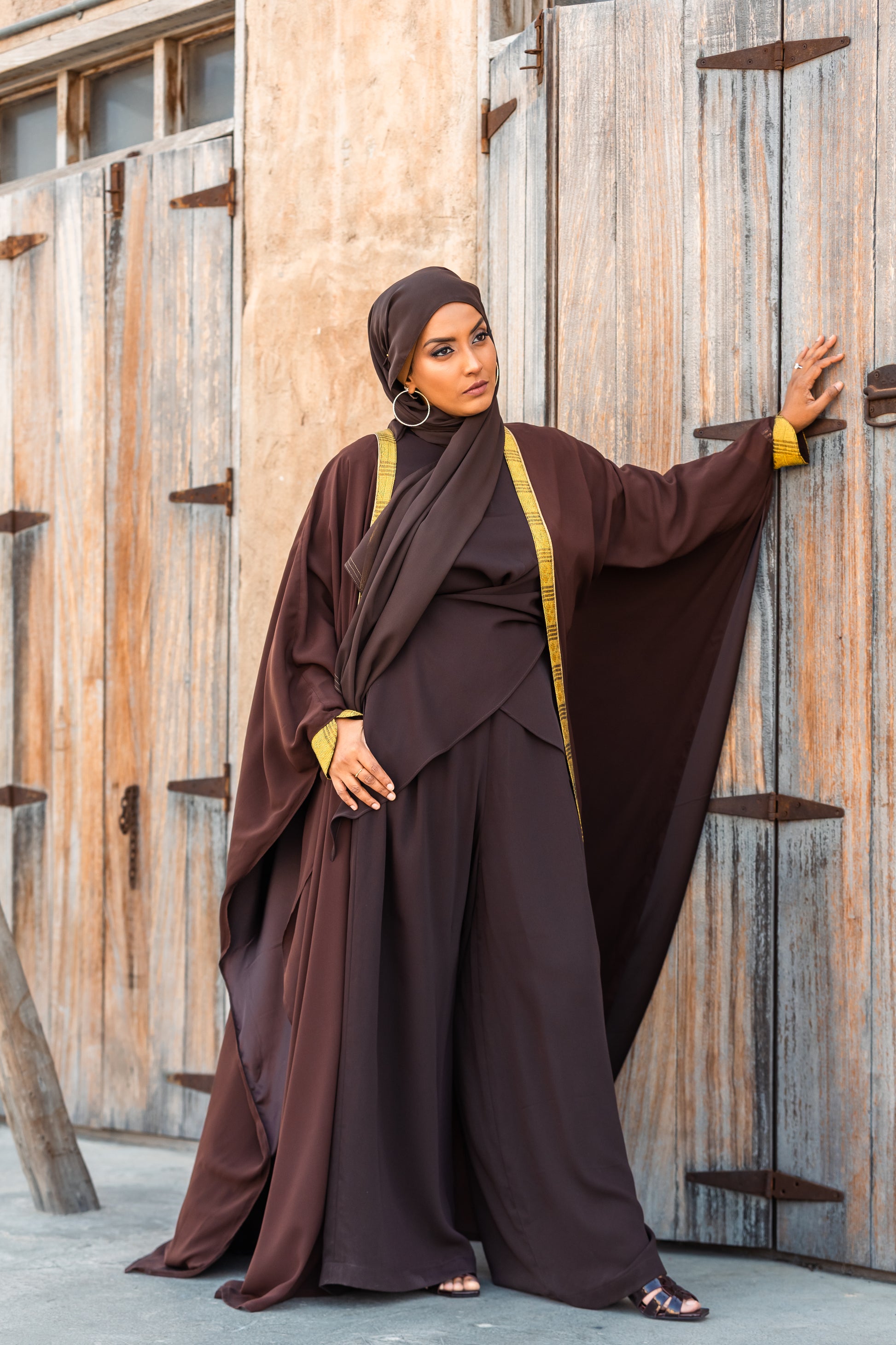 With its warm earth tones and vibrant mustard accents, the Zaha Set is a stunning option for outdoor Eid celebrations. Transform the look by styling the Abaya as a structured kimono, or wear it open as a regal layer for a more dramatic silhouette.