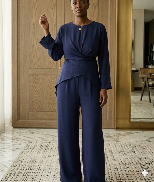 2- Piece Chic Ensemble: Modular Wrap Top, Adjustable Pleated Pants