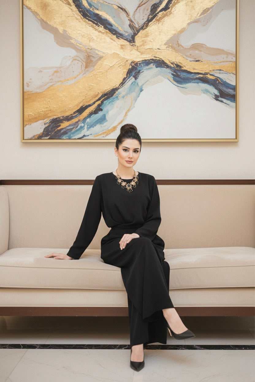 • Signature Pleated Pants: High-waisted with a wide-leg cut, these pants feature fluid pleating that offers both structure and breathability, ideal for modest elegance under a warm weather. Its stretchy adjustable waist allows the confort of lounge wear while providing an elegant sleek finish.
